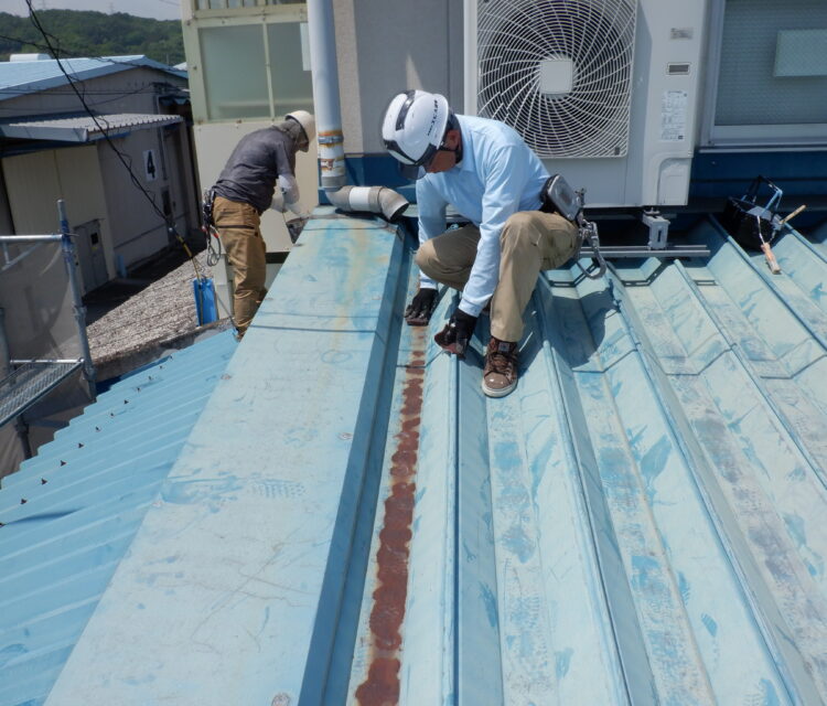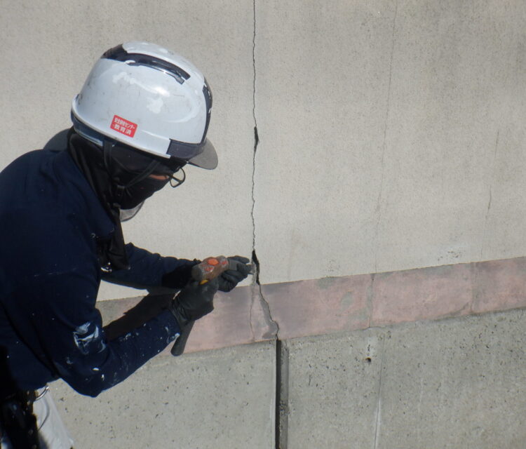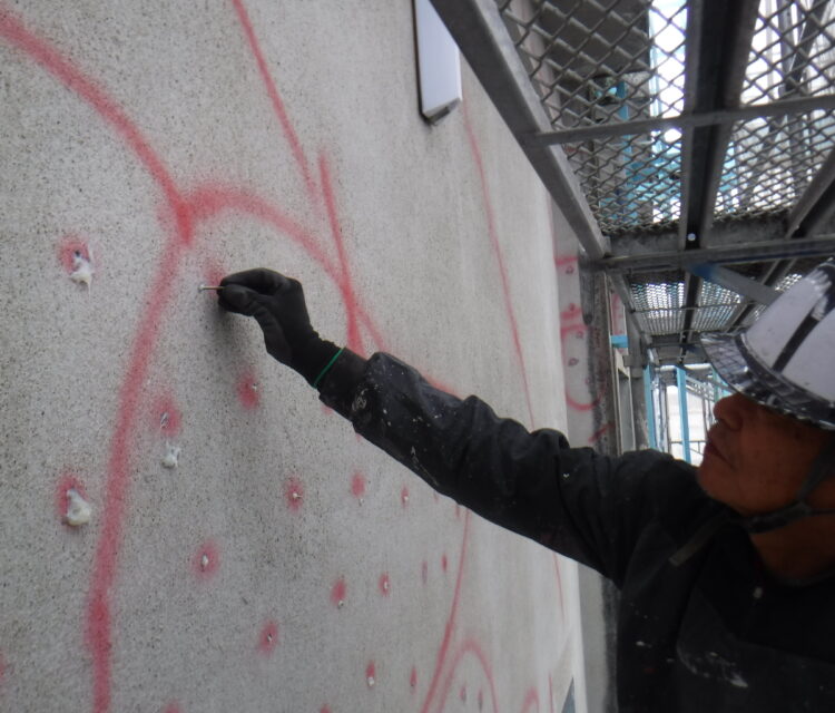 | 2.現場調査 | 1級(2級)建築施工管理技士が建物の劣化状況を確認し、適切な施工方法を検討の上、正確な塗装面積を測量します。 |